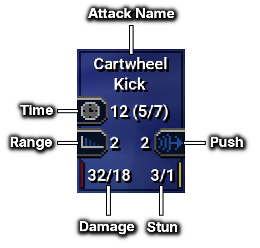 The amount of time required to perform the attack. The first number is the total time. The second number is the startup time, and the third number is the recovery time. (The time values are “game time units,” not seconds.)