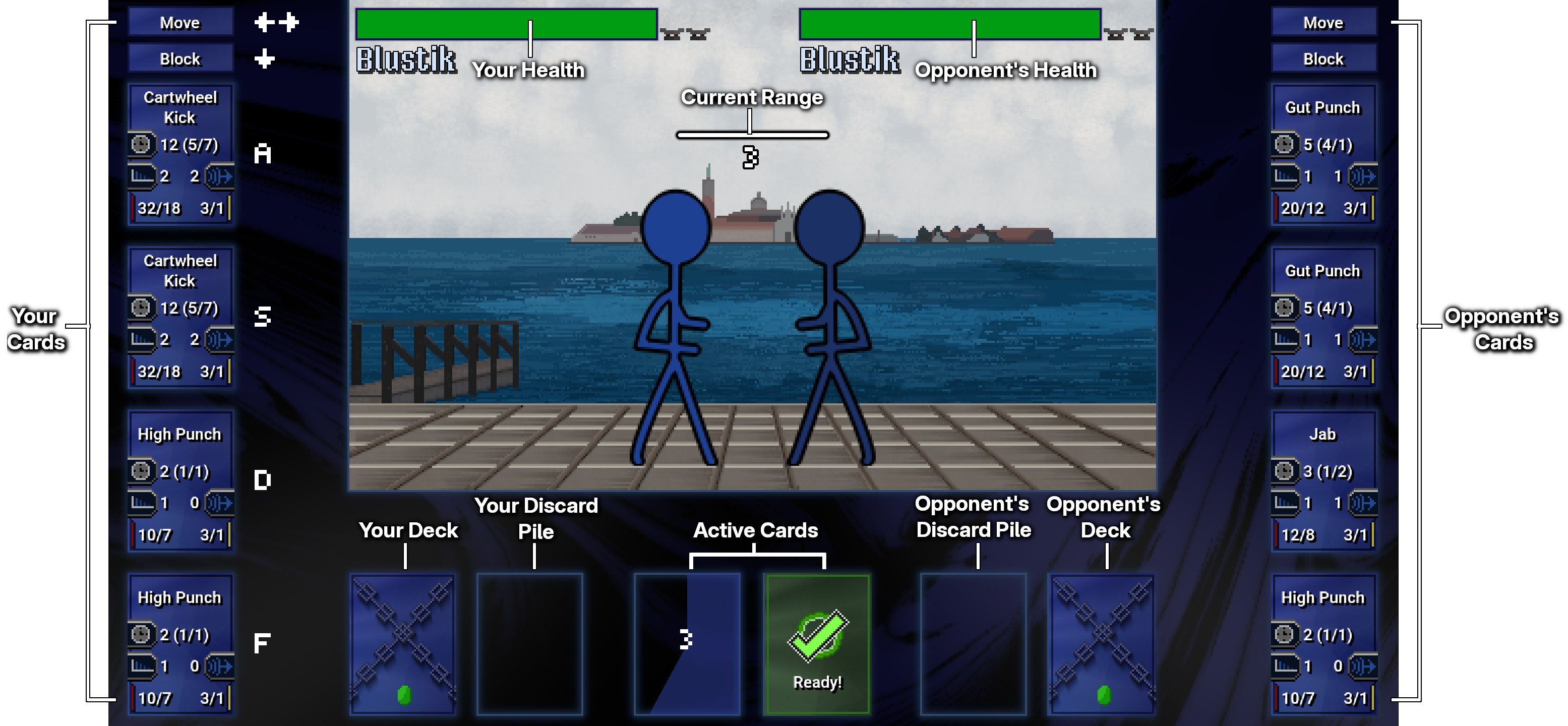 “Card Fight!” is an attempt to imagine what such a game could look like. It has no complex inputs, just single key presses assigned to actions. Because the game pauses whenever characters can take an action, it doesn’t require fast responses. The card interface makes all the attack properties visible during the game, such as the animation times, range, and hit-stun/block-stun values. The card approach also requires players to make effective use of a limited set of options and adds randomized unpredictability to the attacks that each character has available at any time.